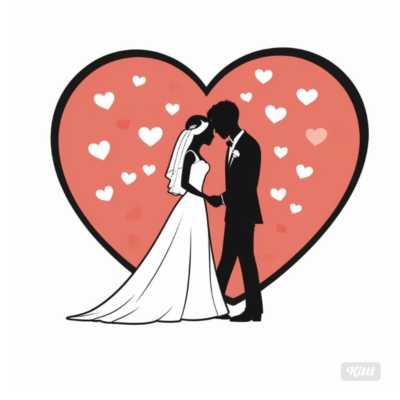 - Description: A beautifully crafted silhouette of a bride and groom, standing hand-in-hand against a romantic heart-shaped background. This timeless design captures the essence of love and commitment, ideal for wedding cards, posters, and digital projects.