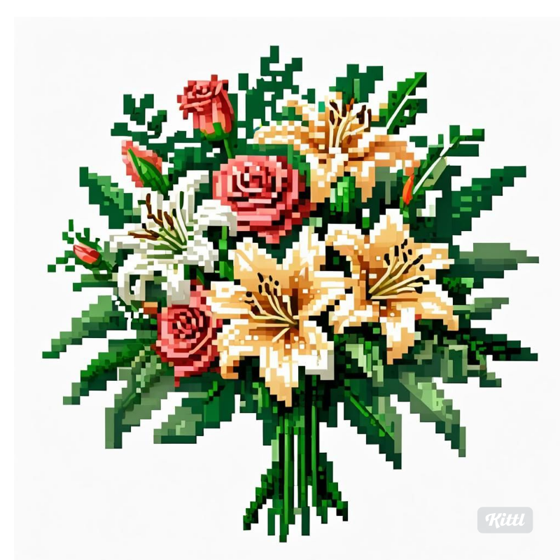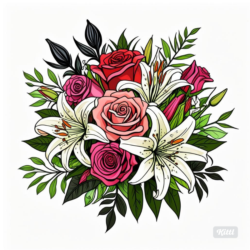 - Description: A delicate wedding bouquet illustration, featuring a harmonious blend of roses, lilies, and lush greenery. The soft colors and intricate details make it an ideal choice for wedding programs, bridal shower invites, or decorative artwork.