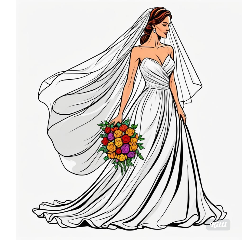 - Description: A graceful depiction of a bride in a flowing wedding dress, complete with a veil and a bouquet of fresh flowers. This elegant illustration captures the beauty and joy of the bride, perfect for bridal shower decorations, wedding websites, or invitations.
