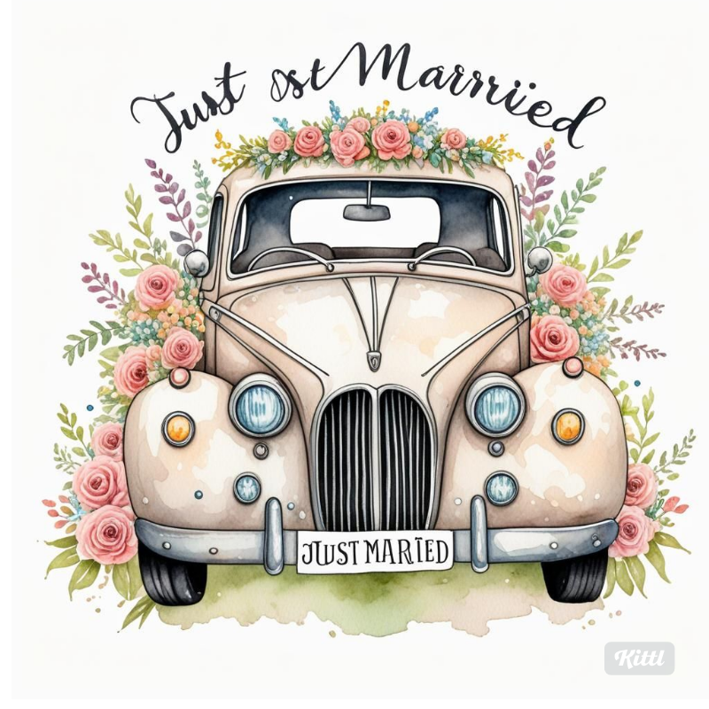 - Description: A charming vintage wedding car, beautifully adorned with fresh flowers and a 'Just Married' sign. This nostalgic design evokes a sense of timeless romance, perfect for wedding announcements, thank-you cards, or decorative prints.